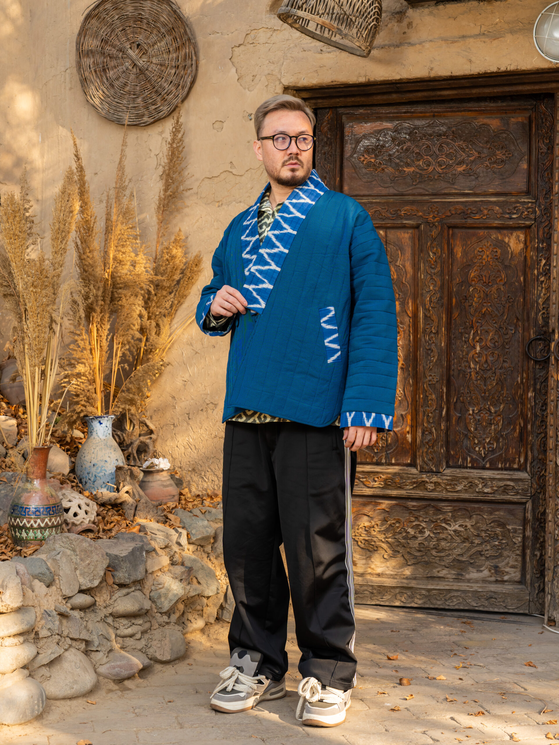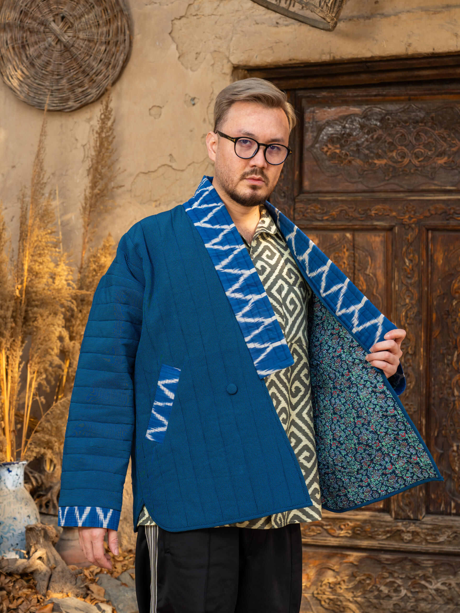 A comfortable, one-of-a-kind jacket made from natural cotton denim with authentic vintage Uzbek bekasam inserts. Uniquely handcrafted by the Human Wear designer, it features traditional handmade jiyak braid detailing and practical pockets. Designed with dropped sleeves and loose shoulders for a relaxed fit.