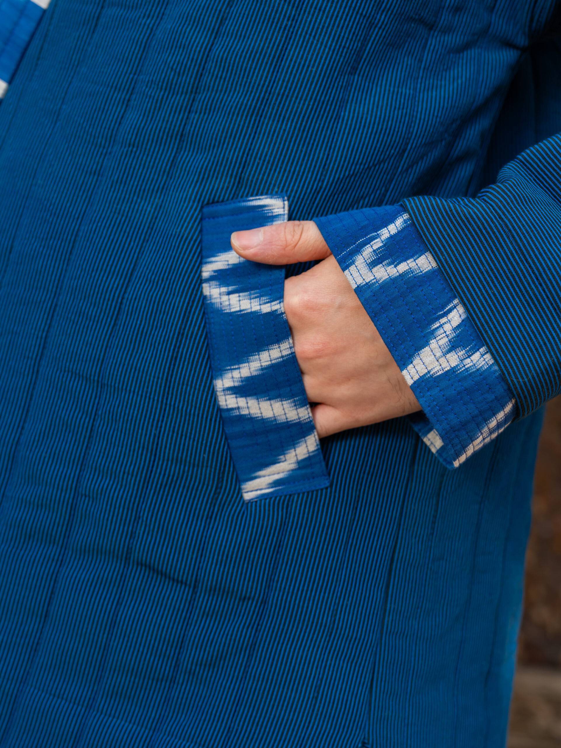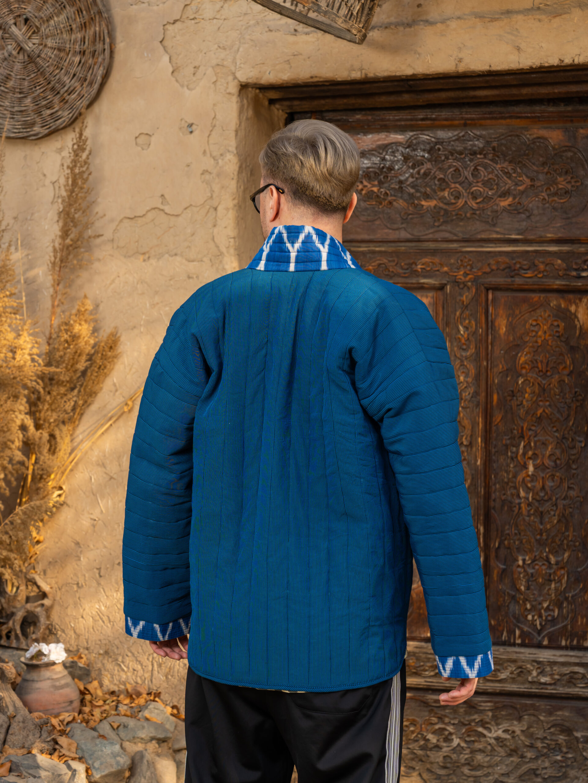 Comfortable jacket made from natural cotton bekasam. This jacket is unique, 100% handmade, one of a kind, sewn by the designer of the brand “Human Wear”. The jacket with pockets. The jacket is insulated and quilted.