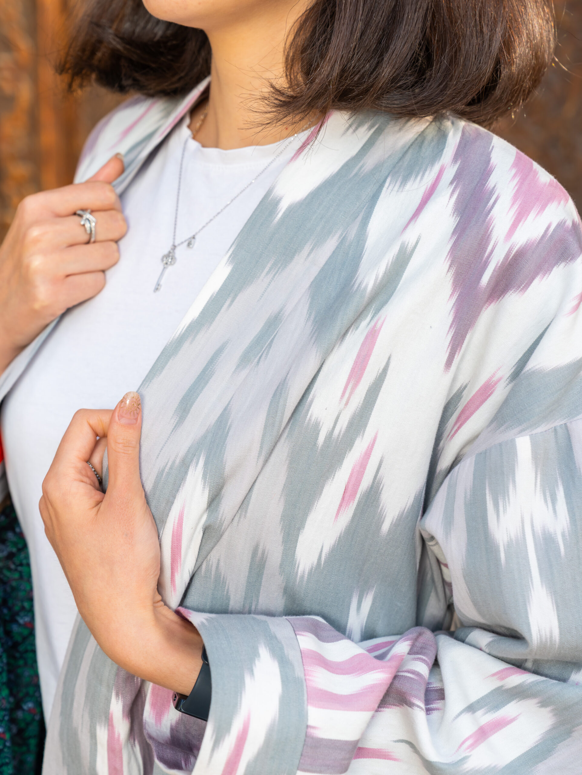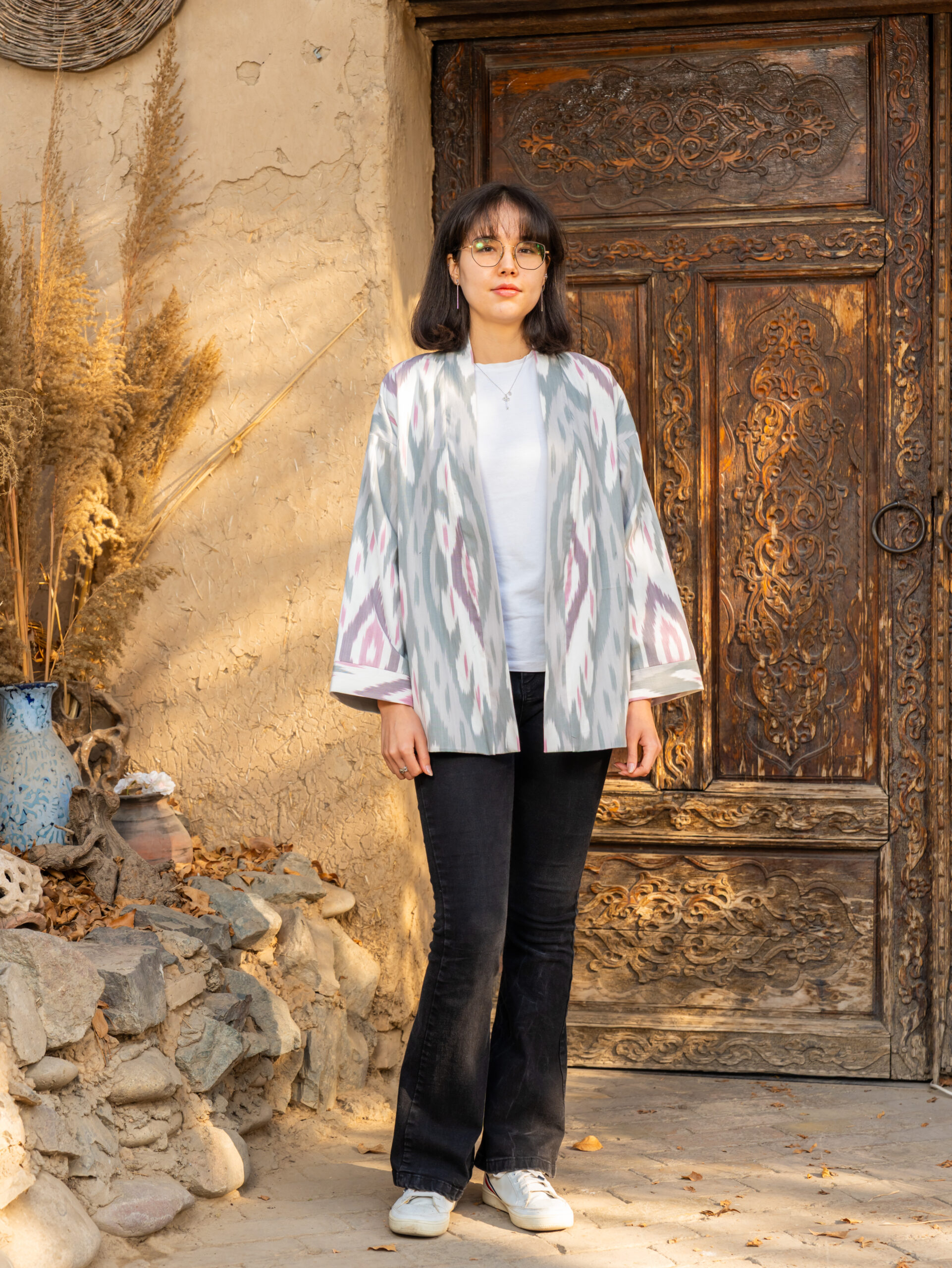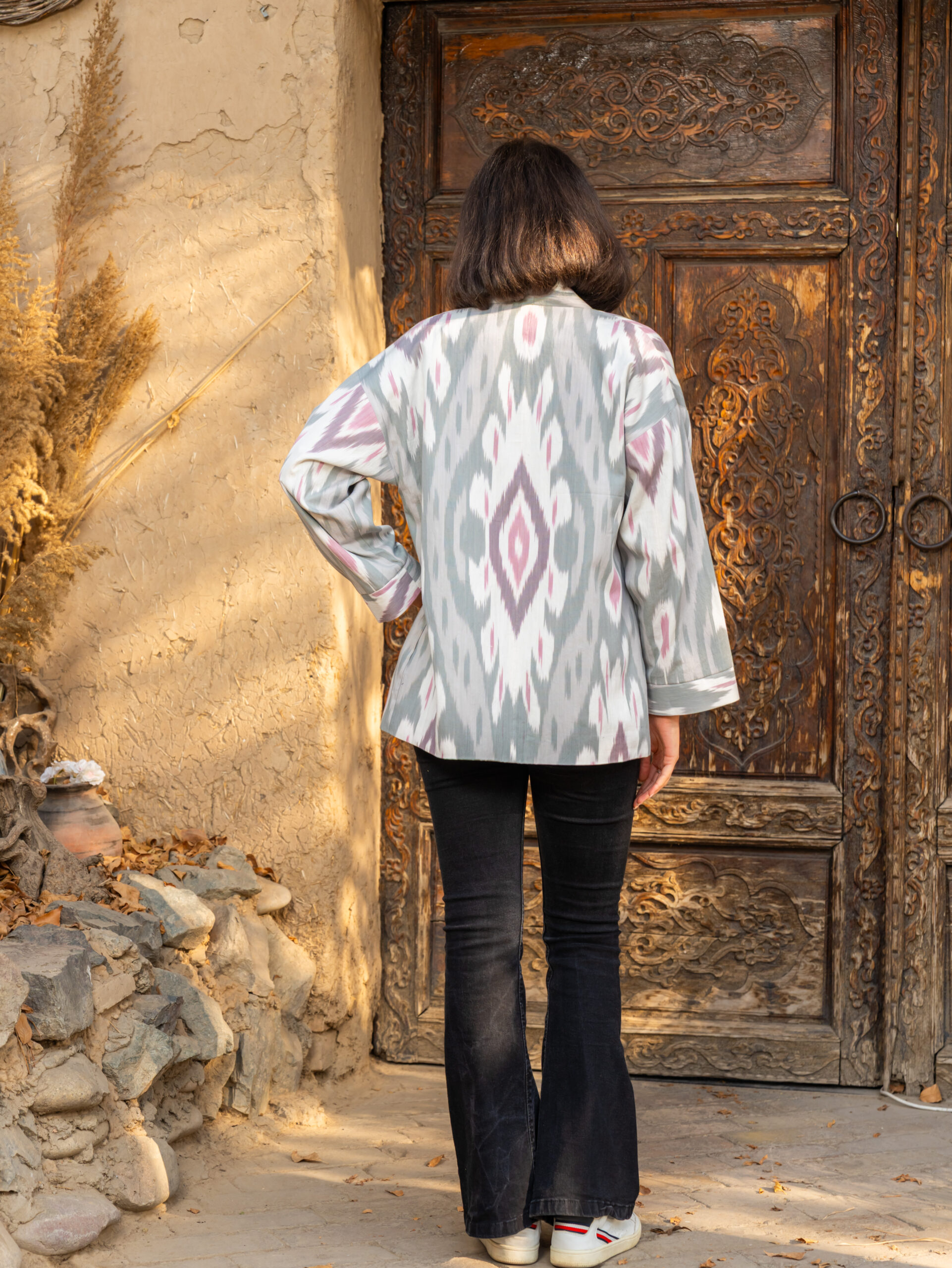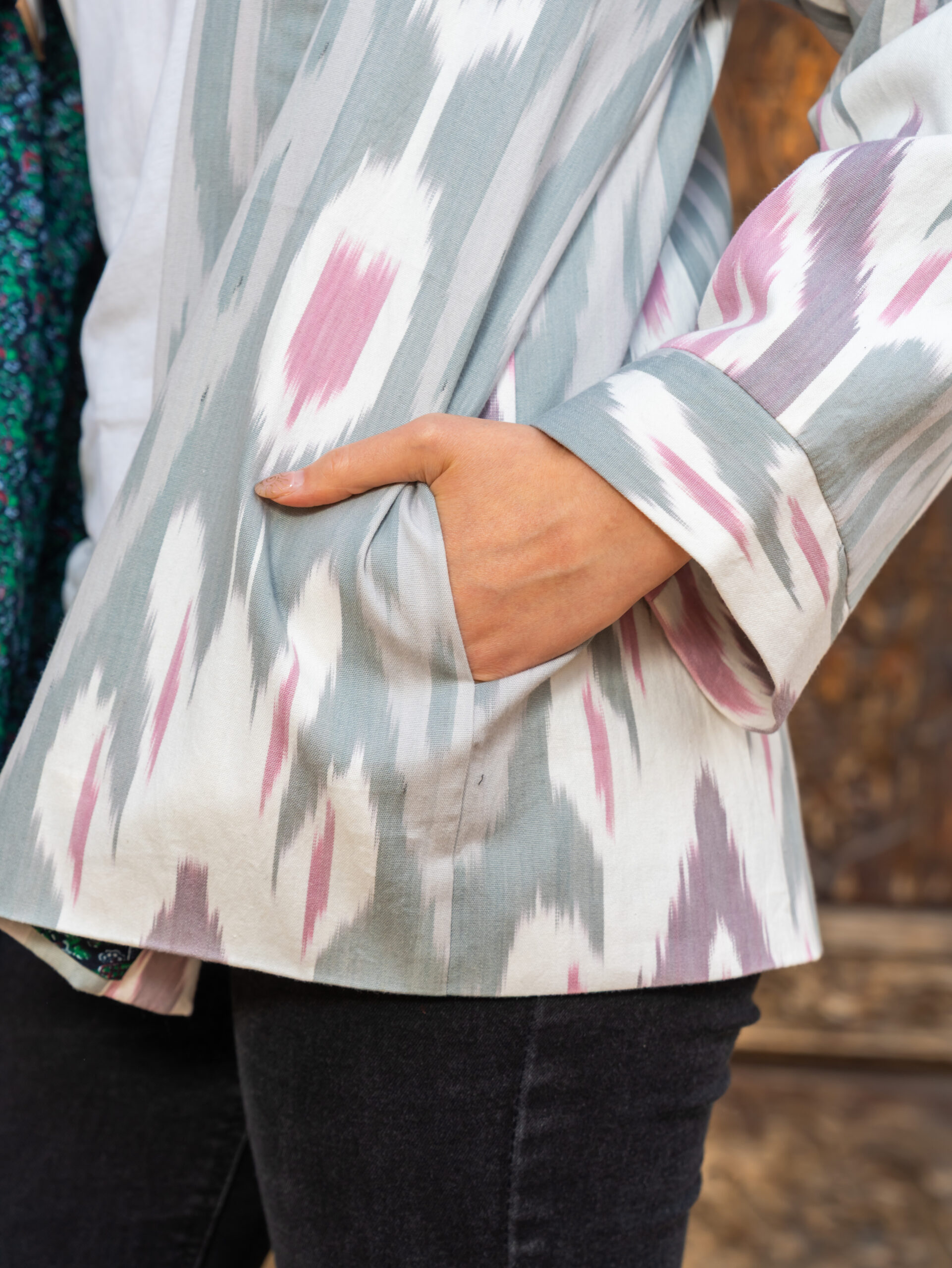 Comfortable jacket made from natural cotton adras. This jacket is unique, 100% handmade, one of a kind, sewn by the designer of the brand “Human Wear”.  The jacket with pockets.