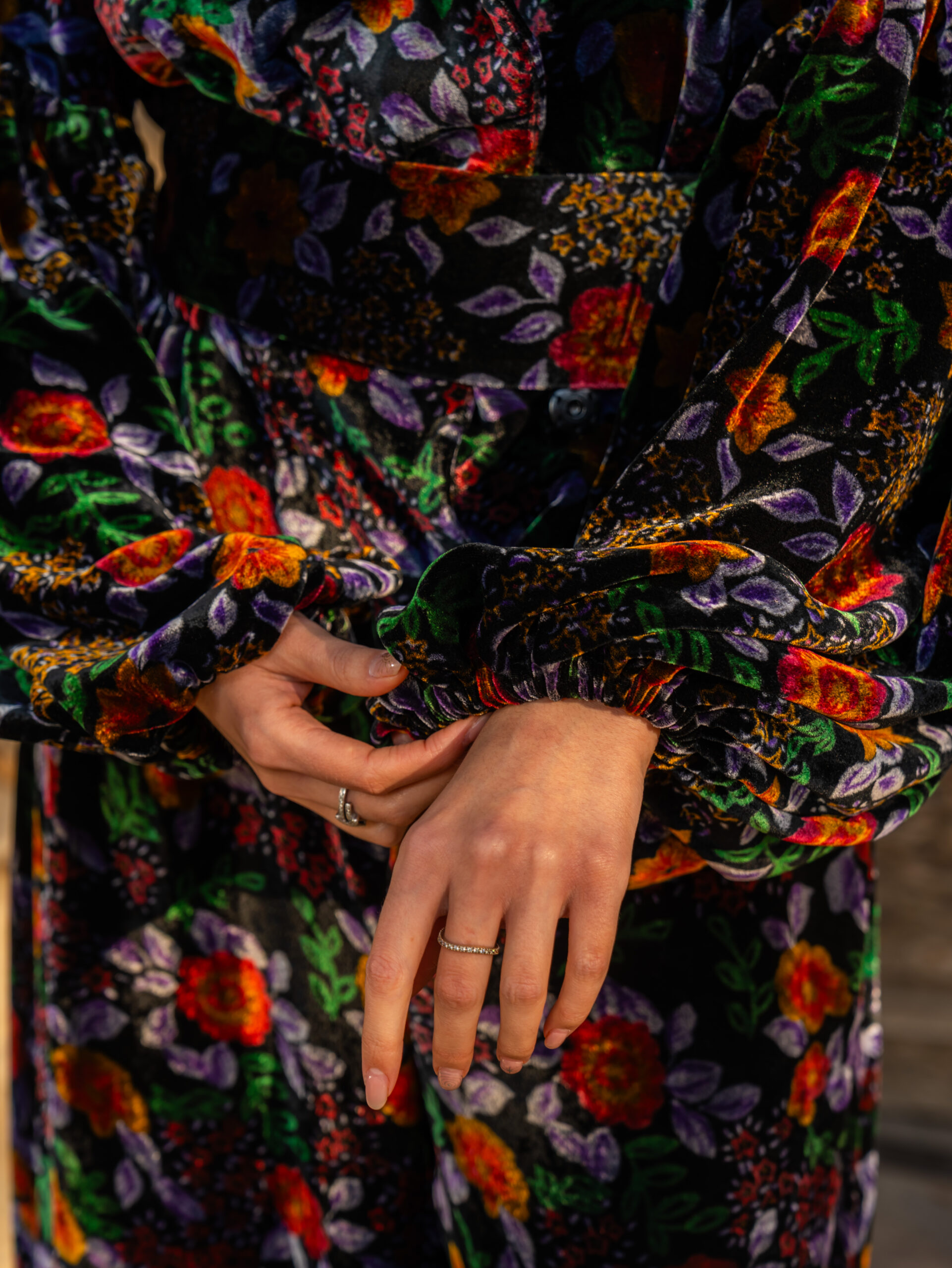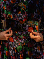 Luxurious vintage silk velvet cummerbund with belt at the waist. This item is unique, one of a kind, sewn by the designer of the brand “Human Wear”. Upcycling model. Vintage fabric, item is new.  The waist is decorated with belt on buttons.
