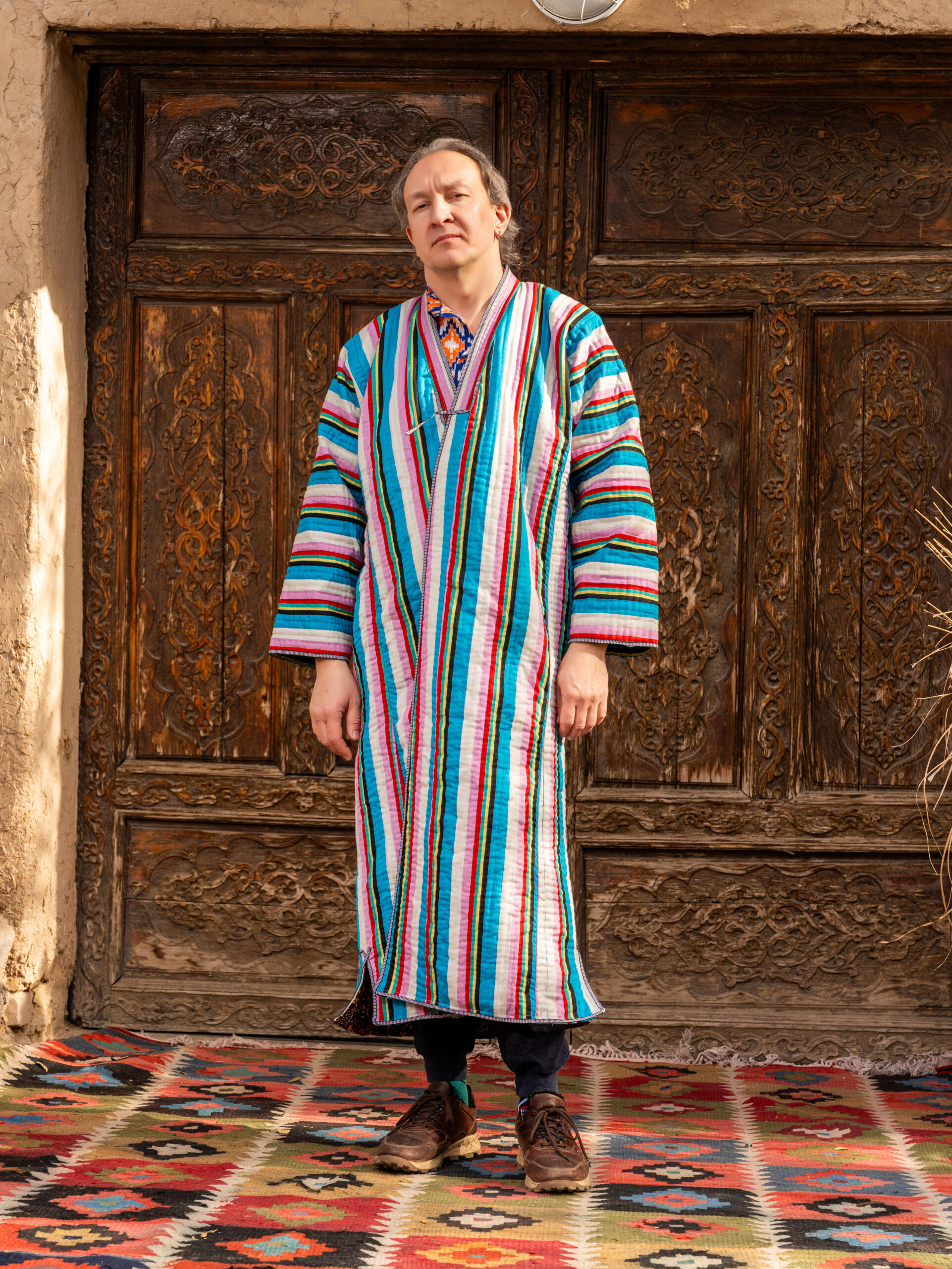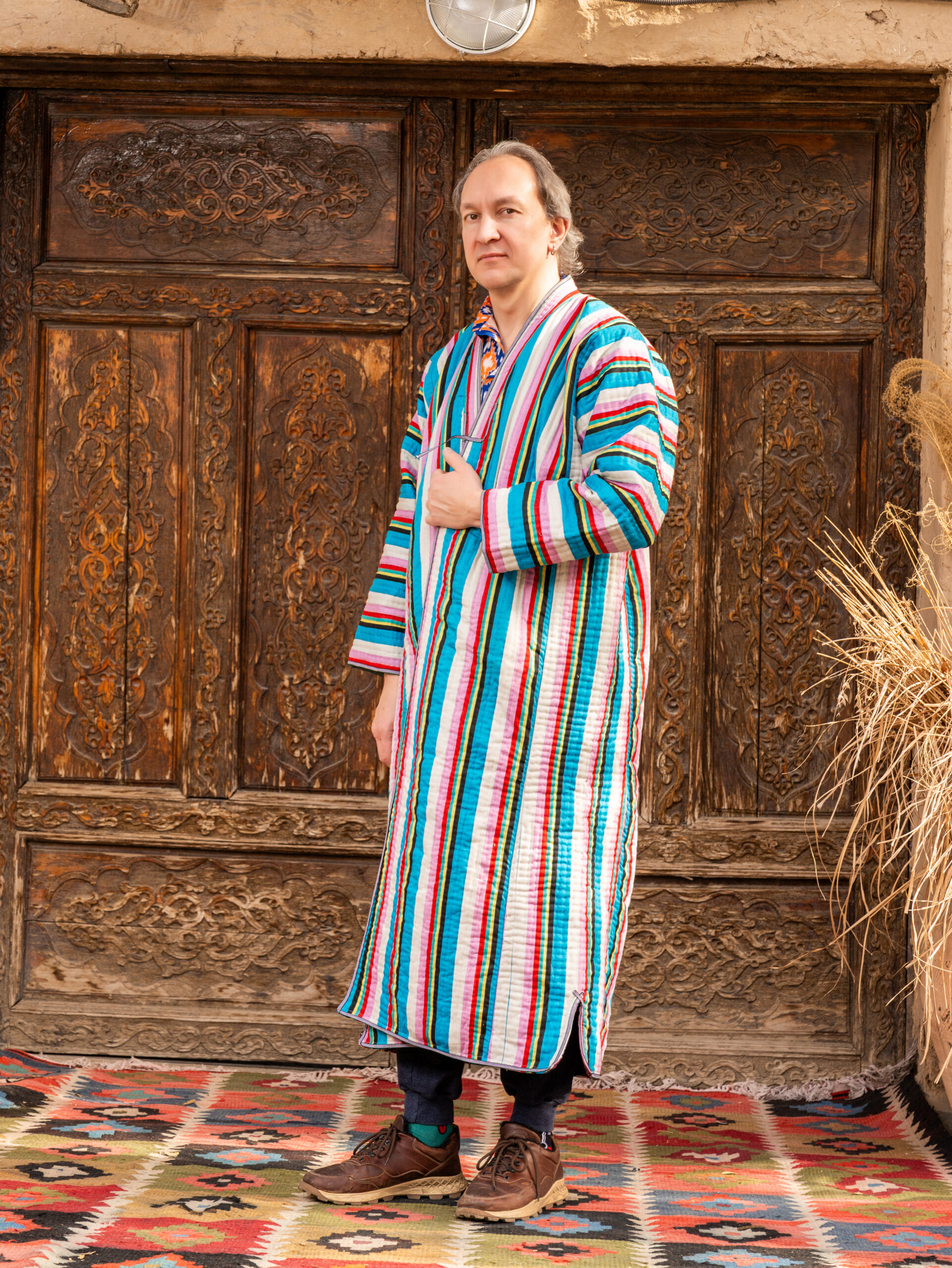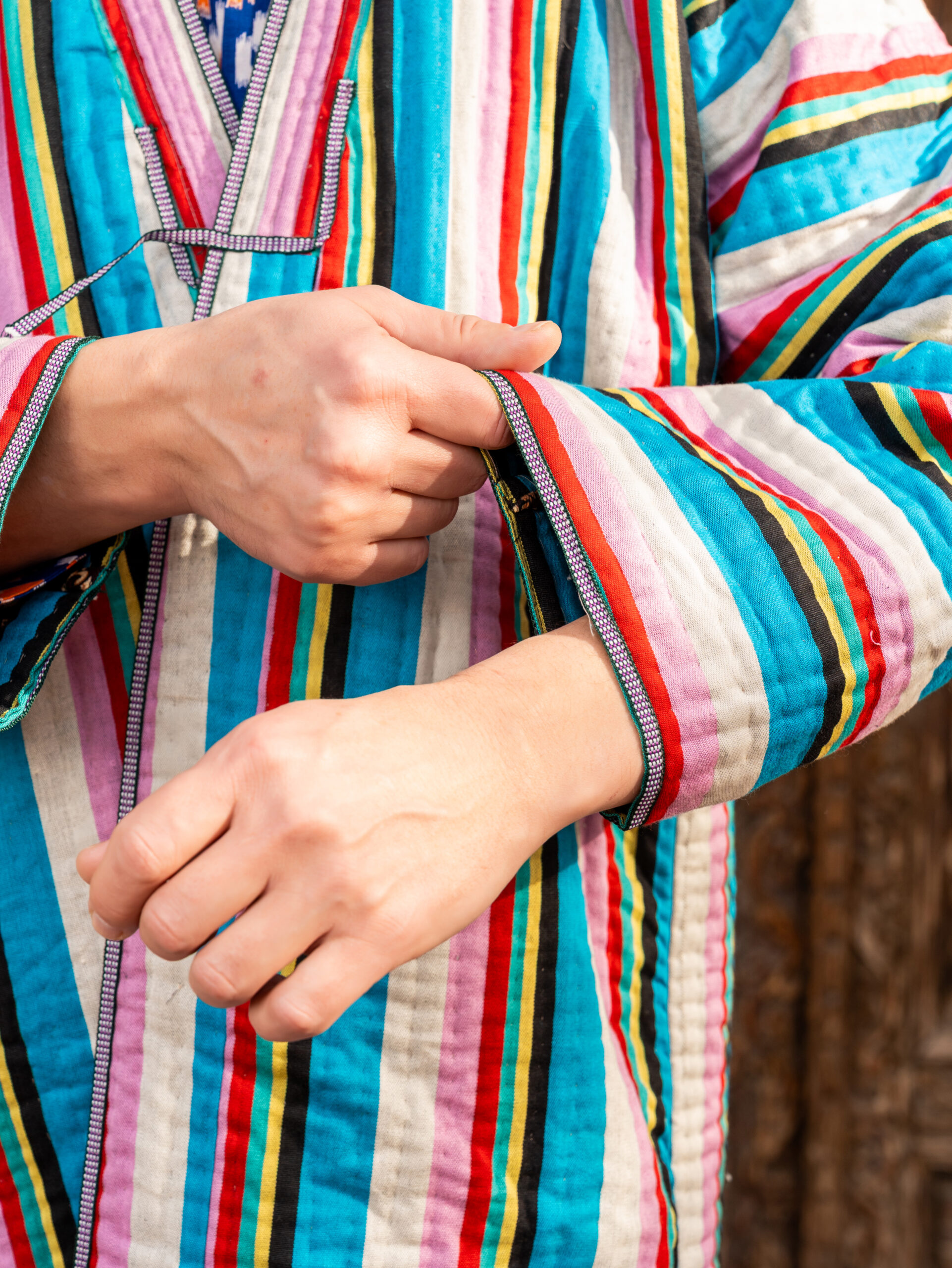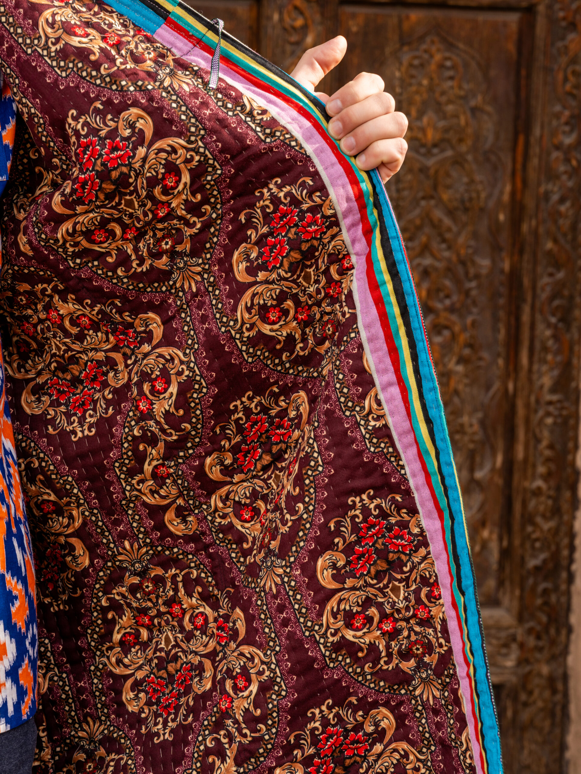 Comfortable jacket made from natural cotton bekasam. This jacket is 100% handmade, one of a kind, sewn by the famous Uzbek Gulnara Chorieva. Chapan with hand quilting and cotton insulation.